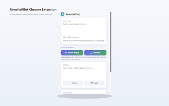 RewritePilot هو مساعد بريد إلكتروني قوي يعتمد على الذكاء الاصطناعي مصمم لتعزيز تواصلك عبر البريد الإلكتروني داخل Gmail و Outlook. هذه الأداة الإضافية المجانية تركز على توليد ردود سريعة وذكية وإعادة كتابة المسودات لضمان الوضوح والاحترافية. إنها مفيدة بشكل خاص للمهنيين المشغولين الذين يجدون أنفسهم غالبًا يستجيبون لعدد كبير من رسائل البريد الإلكتروني، مما يسمح لهم بتوفير الوقت مع الحفاظ على نبرة مصقولة في مراسلاتهم.